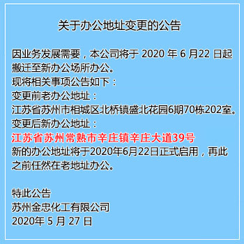 蘇州金忠化工有限公司成立于1995年元月,位于人杰地靈、山清水秀的蘇州市相城區(qū)。而生產工廠則位于國家級化工園區(qū)-蘇州常熟市新材料產業(yè)園區(qū)。 園區(qū)水、電、汽設備配套齊全。生產工廠占地面積70,000m2,擁有標準廠房50,000m2,2002年通過了ISO9001國際質量體系認證。